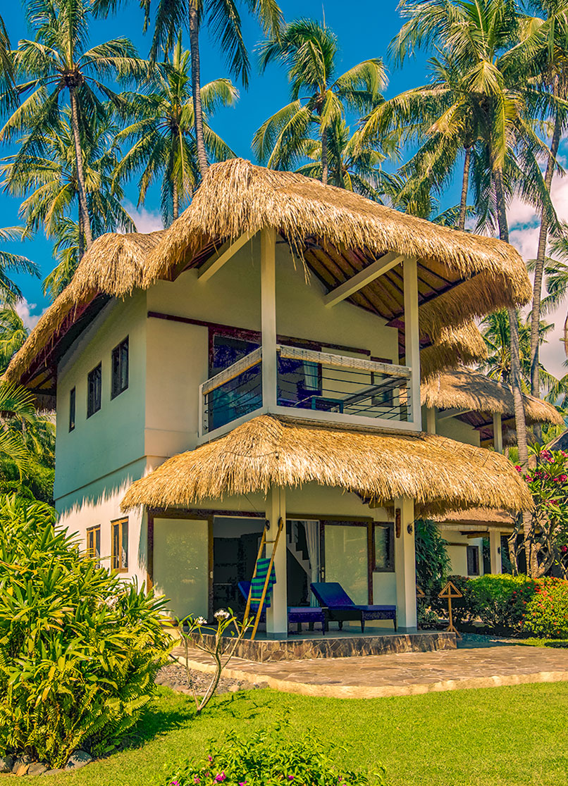 Großzügige, zweistöckige Villen im balinesischen Stil mit separatem Wohnbereich, Essplatz und Schlafzimmer im Obergeschoss. Alle Villen bieten herrlichen Meerblick von Terrasse und Balkon.